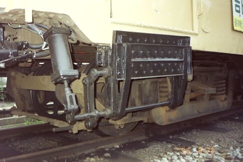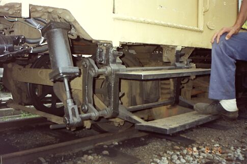 | 当時の福井鉄道の車両は、鉄道線用の高床車で、福井市内の軌道部分へ乗り入れる電車は、低床ホームからの乗降用に折り畳み式の2段ステップが付いていました。鉄道車両の2段ステップは珍しく、名鉄にも鉄軌道直通の510形などがいましたが1段ステップでした。事前調査したら写真のように1つのエアシリンダとリンク機構で動作する巧みな構造になっていました。エアシリンダなどの部品を福井鉄道から提供してもらい、改造して600形に取り付けました。 | |