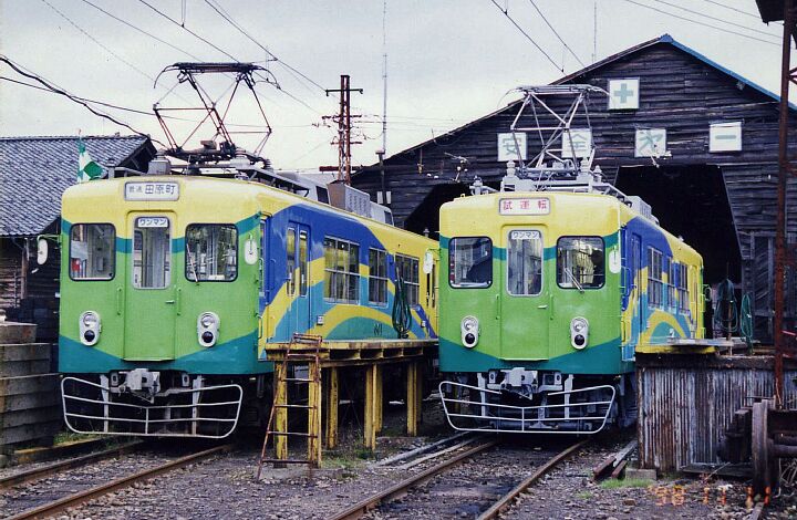 福井鉄道600形602号 ② 西武生車庫 1998(H10).11.11 西武生へ搬入された602号(右) 左には1年前に搬入された601号。 600形が2両並びました。 |