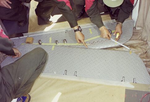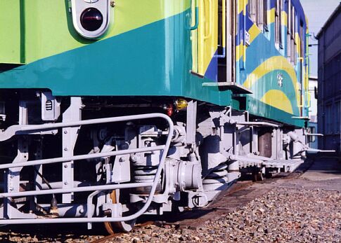 | 610形の試運転 1999(H11).11.10 大名町交差点の急カーブで、危惧していた幅広の貫通路の渡り板の動きを確認。渡り板に隙間ができないよう、渡り板を継ぎ足した。 |