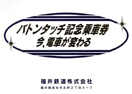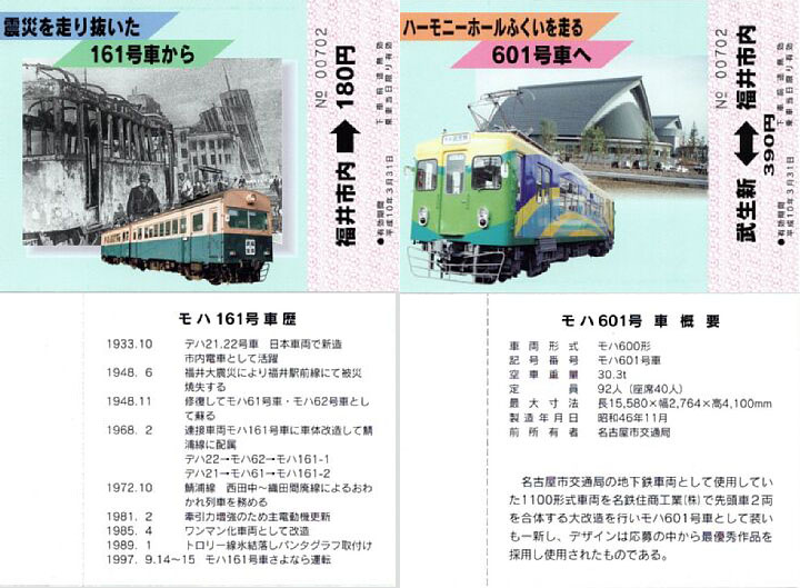 601号の登場を記念して、福井鉄道から「バトンタッチ記念乗車券」が発売されました。 2つ折りのカバーの中に2枚の記念乗車券がセットされた物です。 ↓記念乗車券のカバー ![]() ←記念乗車券2枚セット 上が表面、下が裏面です。 |