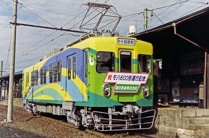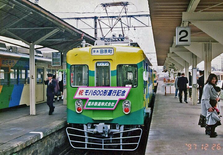 福井鉄道600形601 ② 田原町 1997(H9).12.26 武生新で発車式をしたモハ601は、運行記念のヘッドマークを付けて田原町行き普通列車で初の営業運転を行いました。 |