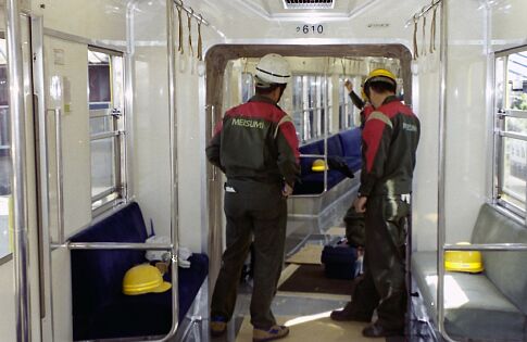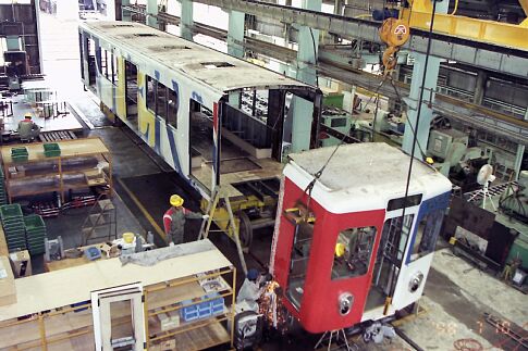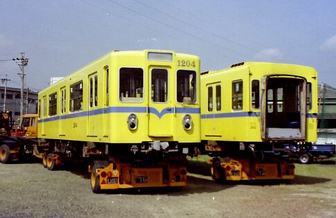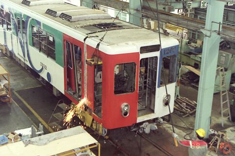 | 名鉄住商・岐阜工場 1998(H10).7.10 両運転台化改造工事。 名城線の1201編成はデザイン塗装車でした。 (左)1202号の運転台部分を切取り。 (右)連結部分を切り取った1201号の車体に1202号の運転台部分を結合。 |