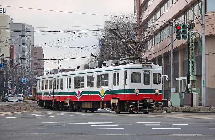 福井鉄道610形 市役所前(現・福井城址大名町) 2012(H24).4.5 大名町交差点の急カーブを曲がり福井駅前に向かう610形で、上の写真の12年後です。塗装は変更されましたが健在でした。 福井鉄道は、名鉄の岐阜市内線・美濃町線の廃止(2005.4.1)により、路面電車タイプの770形・880形連接車9本と800形2両の計20両を譲り受け、鉄道線のホームを低床式に改造して2006(H18).4.1に鉄道線で低床車の運行を開始しました。 それらに混じって輸送力の大きい610形はラッシュ時を中心に活躍していましたが、2018(H30)年に廃車になりました。 |