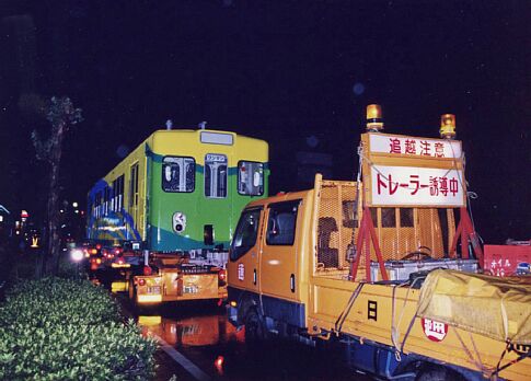 福井鉄道600形の輸送 名鉄住商岐阜工場で改造工事を行った600形は、深夜にトレーラーで福井鉄道西武生車庫へ輸送しました。 先導車-本体(トレーラー)-後続誘導車の順に隊列を組んで無線で連絡を取りながら、国道21号→国道8号を走行しました。私は後続誘導車に添乗しました。40km/h程度で走行するため、片側1車線の道路では深夜でも後ろに車が詰まってきます。多く詰まった場合は後続誘導車から連絡し、先導車が待避可能な場所を見つけ待避し、後ろの車列が過ぎ去ったらすぐ出発することを繰り返しました。 敦賀~武生の区間には断面の小さいトンネルがあり、その場合は先先導車が先回りしてトンネルの先で対向車線の車を止め、道路の真ん中を走りました。急カーブの所も同様で、対向車線の車を止めて走りました。 初めて添乗し、車両のトレーラー輸送の大変さを実感しました。 |