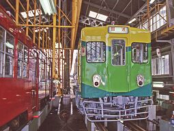 福井鉄道600形602 ① 岐阜工場 1998(H10).10.28 改造工事が完成した602号。 1998.11.9深夜に岐阜工場から福井鉄道西武生車庫へトレーラで輸送しました。 ↓検査ピット上の602号 横には名鉄美濃町線880形 |