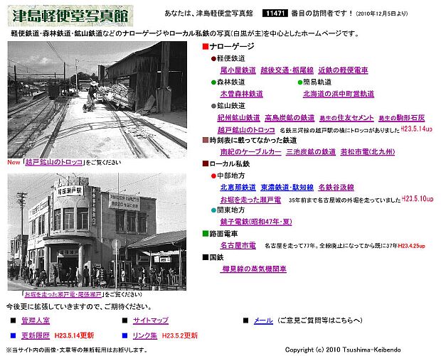 | H27.11.26(開設5周年・追記) ・ホームページを開設してついに5年経過しました。我ながらよく続いたと感心しています… ・写真を提供していただいた方々と、ご覧いただいている皆様に改めて感謝いたします。 ・更新のペースは落ちてきましたが、これからも頑張りますので、津島軽便堂写真館を今後もご愛顧よろしくお願いいたします。 |